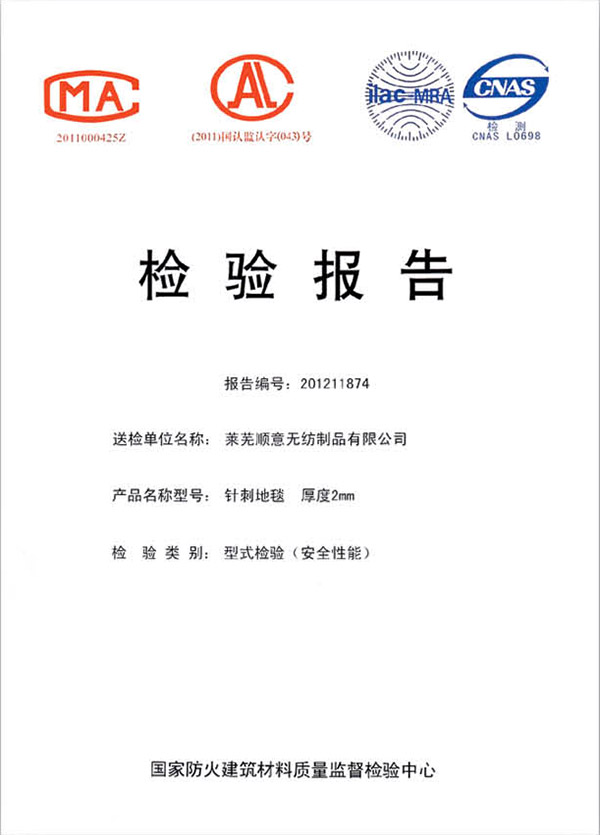 • 本公司生產的無紡阻燃地毯檢測合格